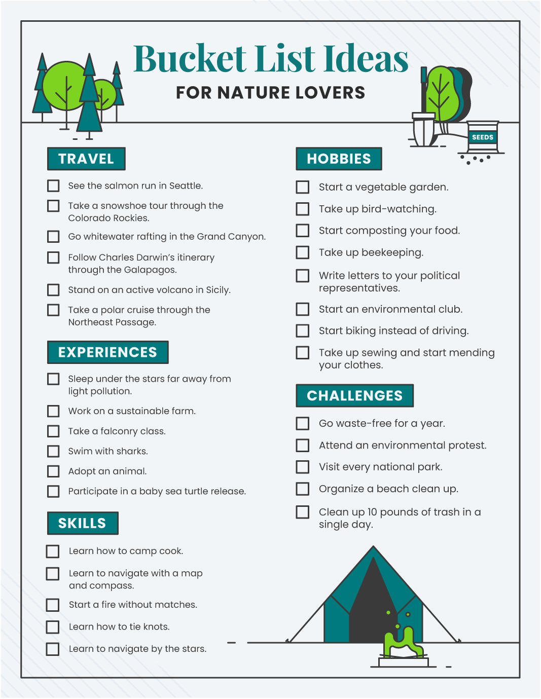 Whether you’re a hardcore outdoorsman or just a casual lover of nature, this bucket list can help carve out a trail for your retirement. View a PDF version here.