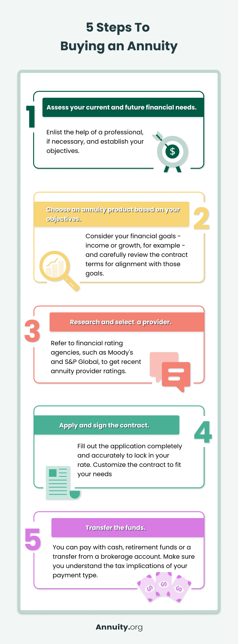 - When buying an annuity, you’ll choose the type of annuity you want, compare offerings from different companies and complete an application with your annuity provider.