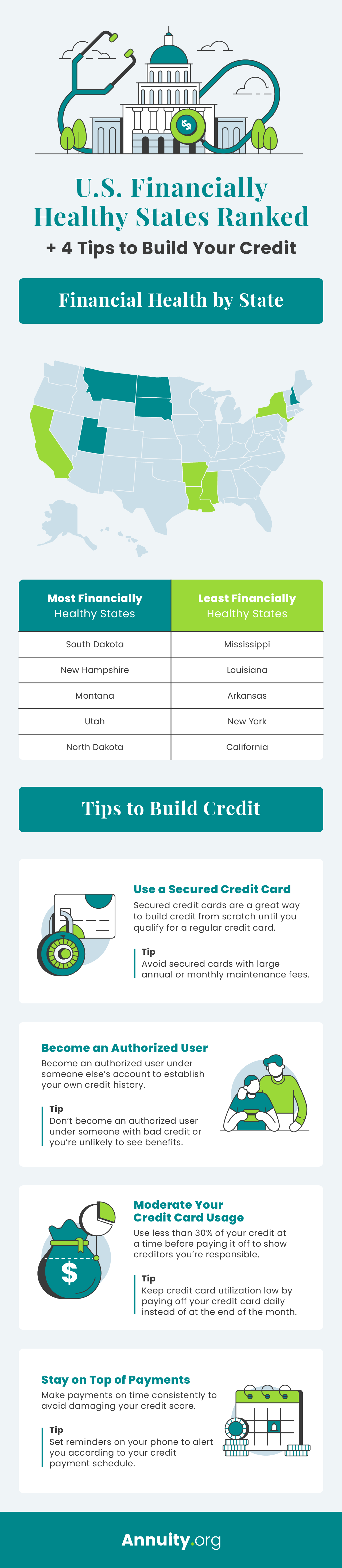 Building your credit score helps you qualify for credit cards and loans. The higher your score, the lower interest rates you’re likely to qualify for on mortgages or personal loans. For more information about average state credit scores, check out the infographic below: